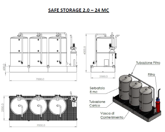 L’impianto di Stoccaggio, può essere sistemato all’interno di capannoni già esistenti oppure può essere posizionato in una qualsiasi area esterna della sede, previa pratica da istruire con il Comune di Competenza per l’occupazione edilizia di nuovi spazi Le operazioni di conferimento, in entrata e in uscita, sono effettuate da un’autobotte che si posiziona nella zona di carico e scarico.